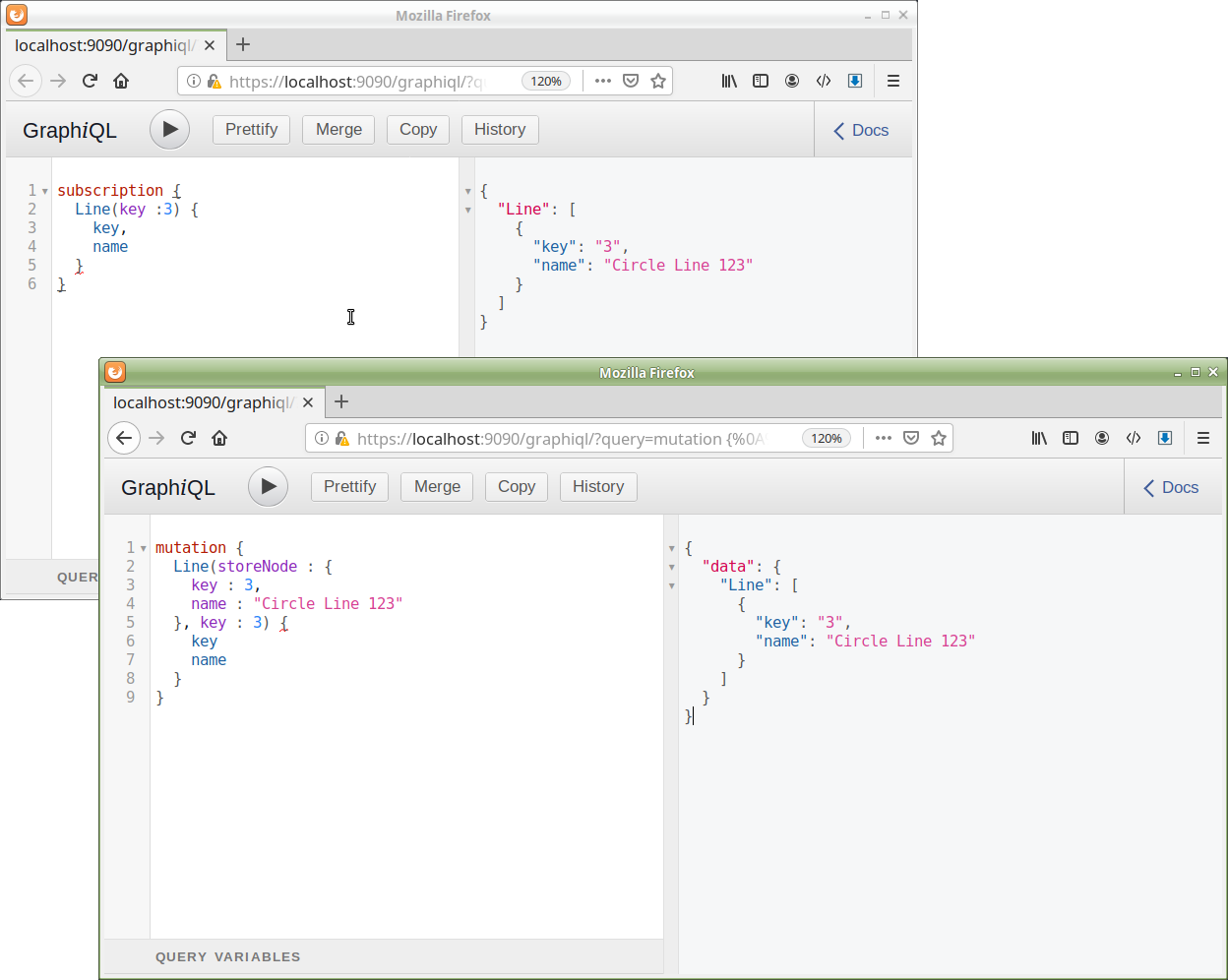 Running now a mutation request in the other window should change the displayed data. Run the following request in the browser window which does not run the subscription: