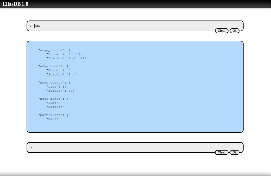 Pressing just enter inserts a line break. Pressing Shift+Enter submits a command. Run the "info" command and confirm that the datastore has data loaded. The datastore is filled with a simple graph. It has Station nodes which represent tube stations and Line nodes which represent tube lines. The Station nodes are connected via Connection edges to each other and via StationOnLine edges with Line nodes. Nodes and edges in the datastore are identified by the kind and the key attribute. A node key needs to be unique per node kind.