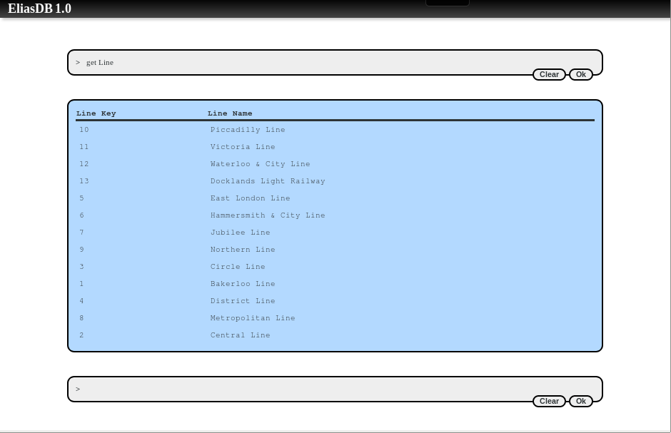 Data in the datastore can be queried using EliasDB's own query language called EQL. A query will only be able to see the nodes of the partition it is run against. You can change the current partition with the part command. The default is main and that is fine for this tutorial. To get a list of all stored tube lines run the command: