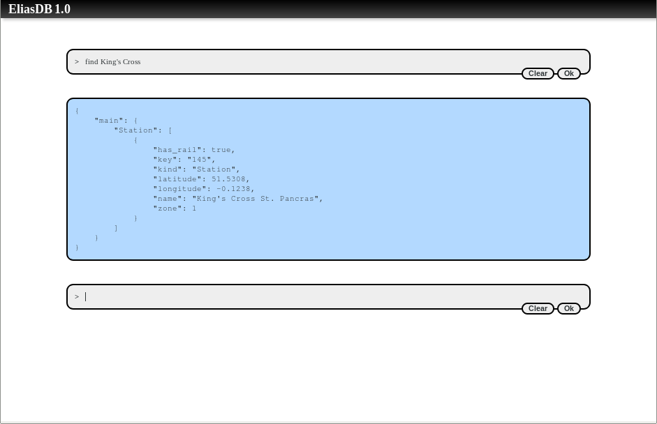 The query should return the Station King's Cross. The index can efficiently lookup words, phrases (multiple consecutive words) and attribute values. Use the index endpoint in the REST API for more specific lookups.